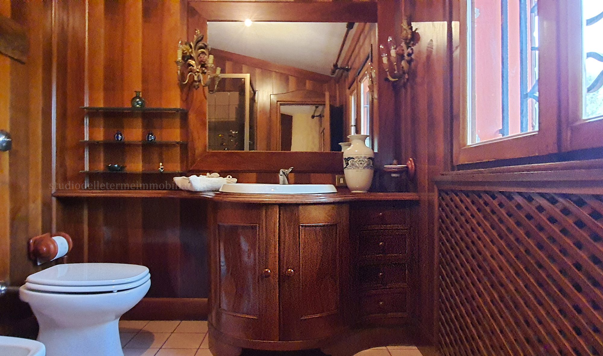 L’abitazione è distribuita su due livelli fuori terra, collegati da una imponente scala in legno, oltre che dall’interrato. Il piano terra ruota intorno al salone a doppia altezza, contornato da vari ambienti come la sala da pranzo, il cabinet, la cucina, ben tre portici il maggiore dei quali trasformato in giardino d’inverno; sul lato opposto la zona notte, con tre camere e due servizi. Il piano superiore è dotato di tre camere da letto, tre bagni, lo studio affacciato sul giardino, una grande terrazza ed un incantevole ballatoio aperto sul doppio volume del soggiorno. Al piano inferiore una grande taverna, la sala cinema, la cucina, la spaziosa cantina ed una serie di ambienti accessori.